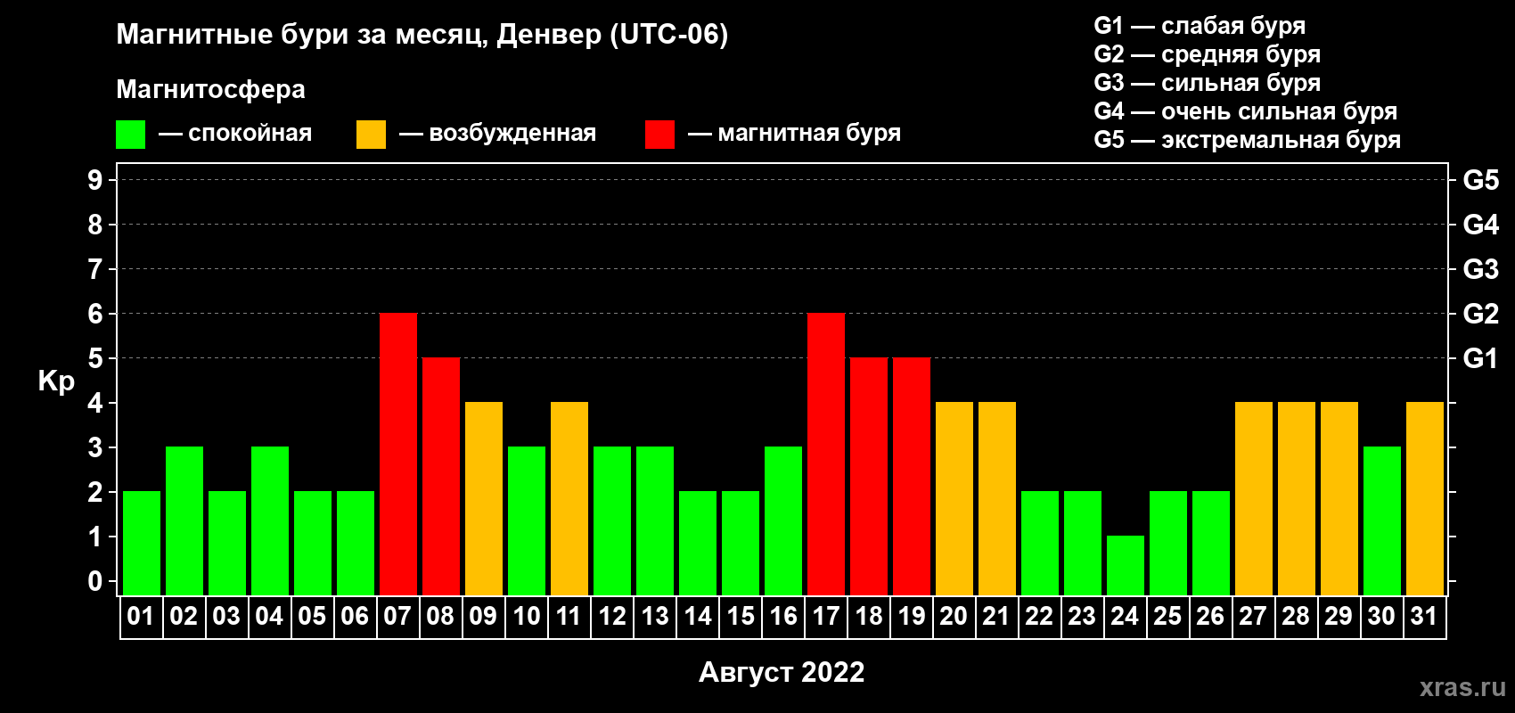 Изменения максимального суточного геомагнитного индекса Kp в августе 2022 года для средних широт