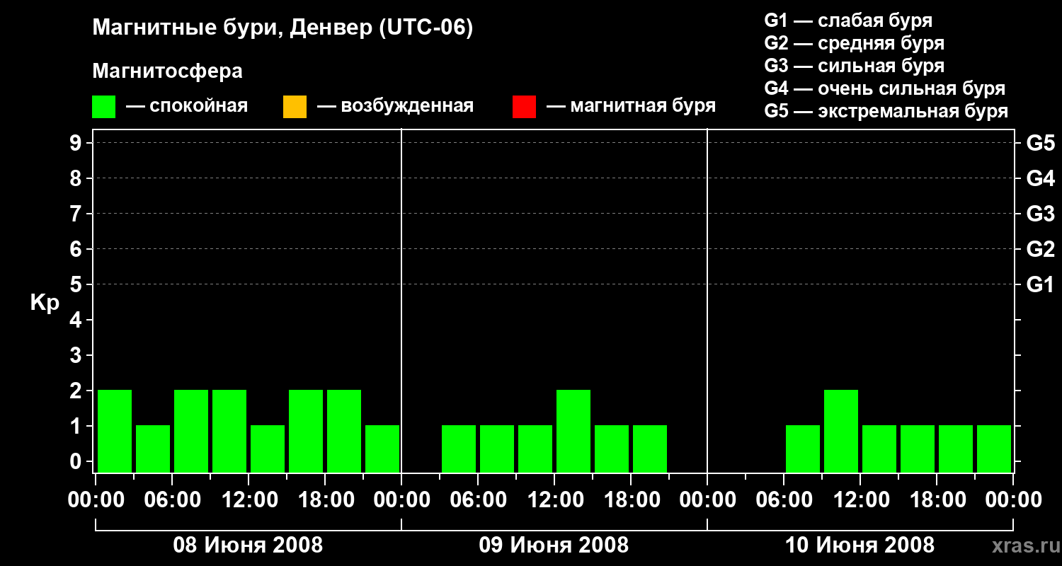 Изменения геомагнитного индекса Kp с 8 по 10 июня 2008 года для средних широт