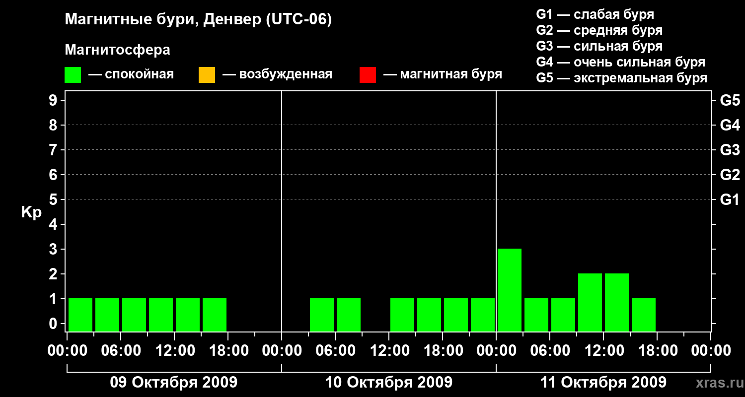 Изменения геомагнитного индекса Kp с 9 по 11 октября 2009 года для средних широт