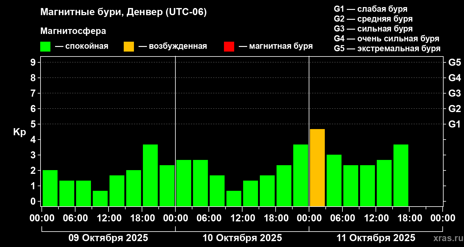 Изменения геомагнитного индекса Kp с 9 по 11 октября 2025 года для средних широт