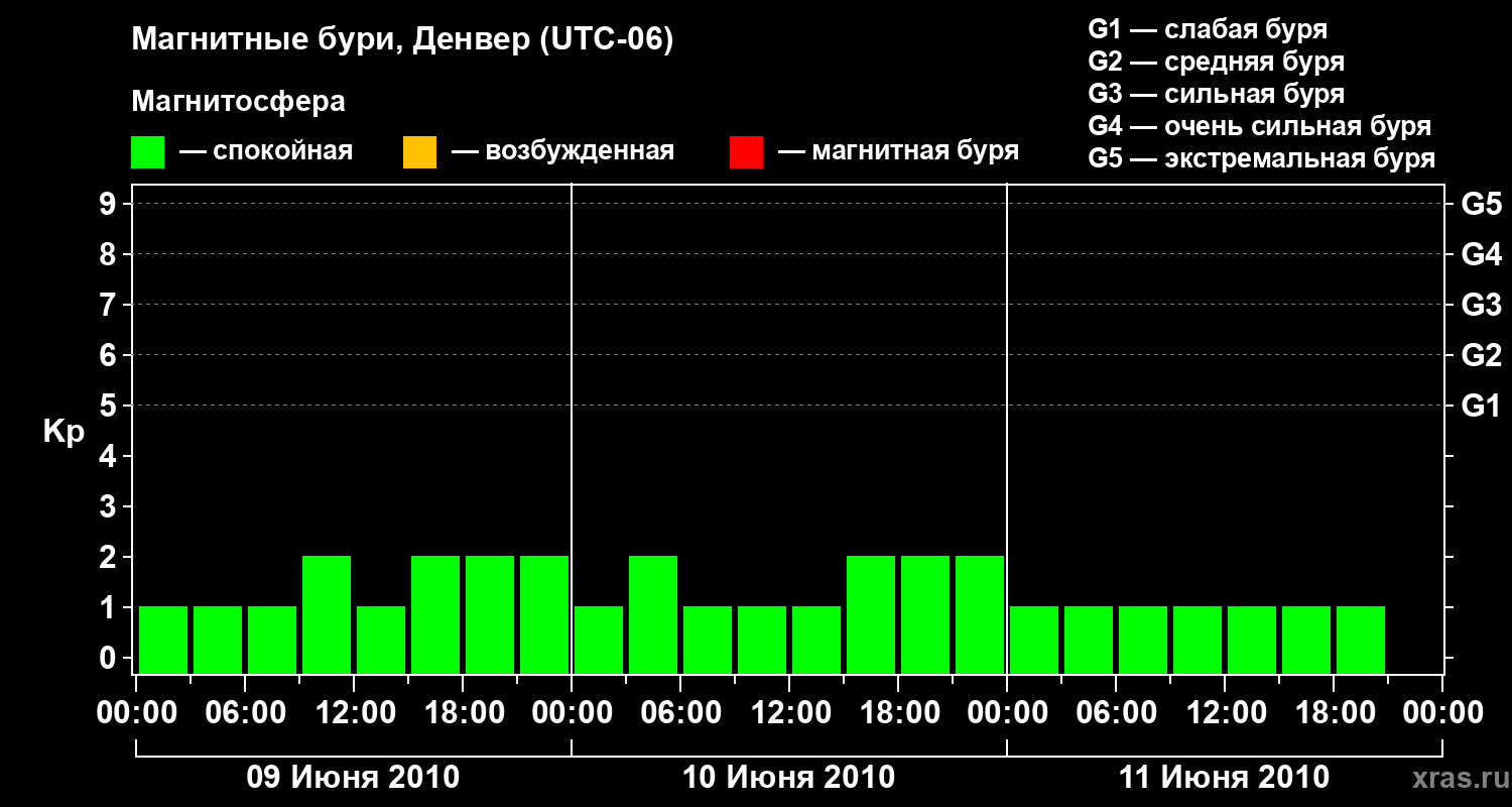 Изменения геомагнитного индекса Kp с 9 по 11 июня 2010 года для средних широт