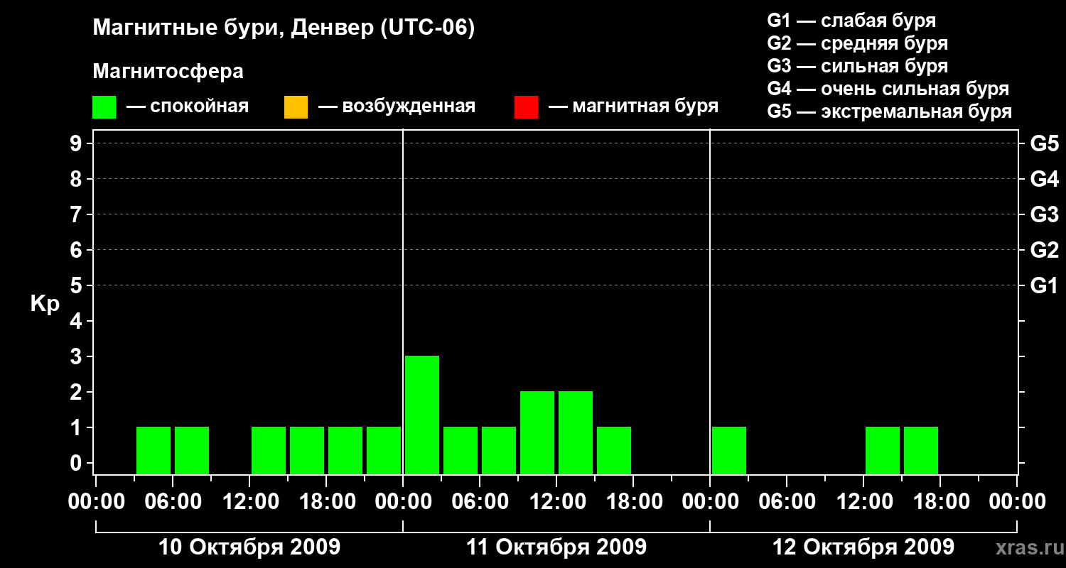 Изменения геомагнитного индекса Kp с 10 по 12 октября 2009 года для средних широт