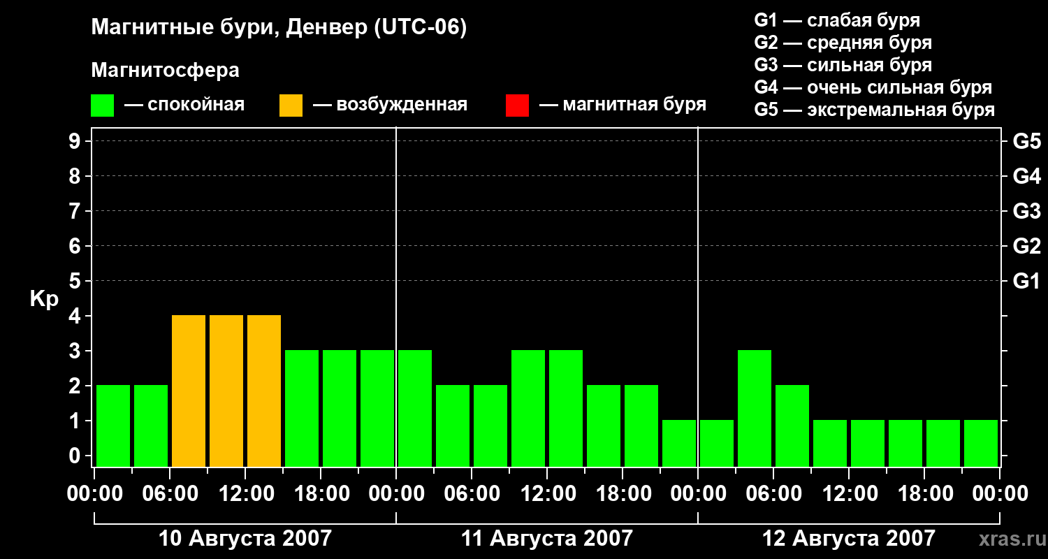 Изменения геомагнитного индекса Kp с 10 по 12 августа 2007 года для средних широт