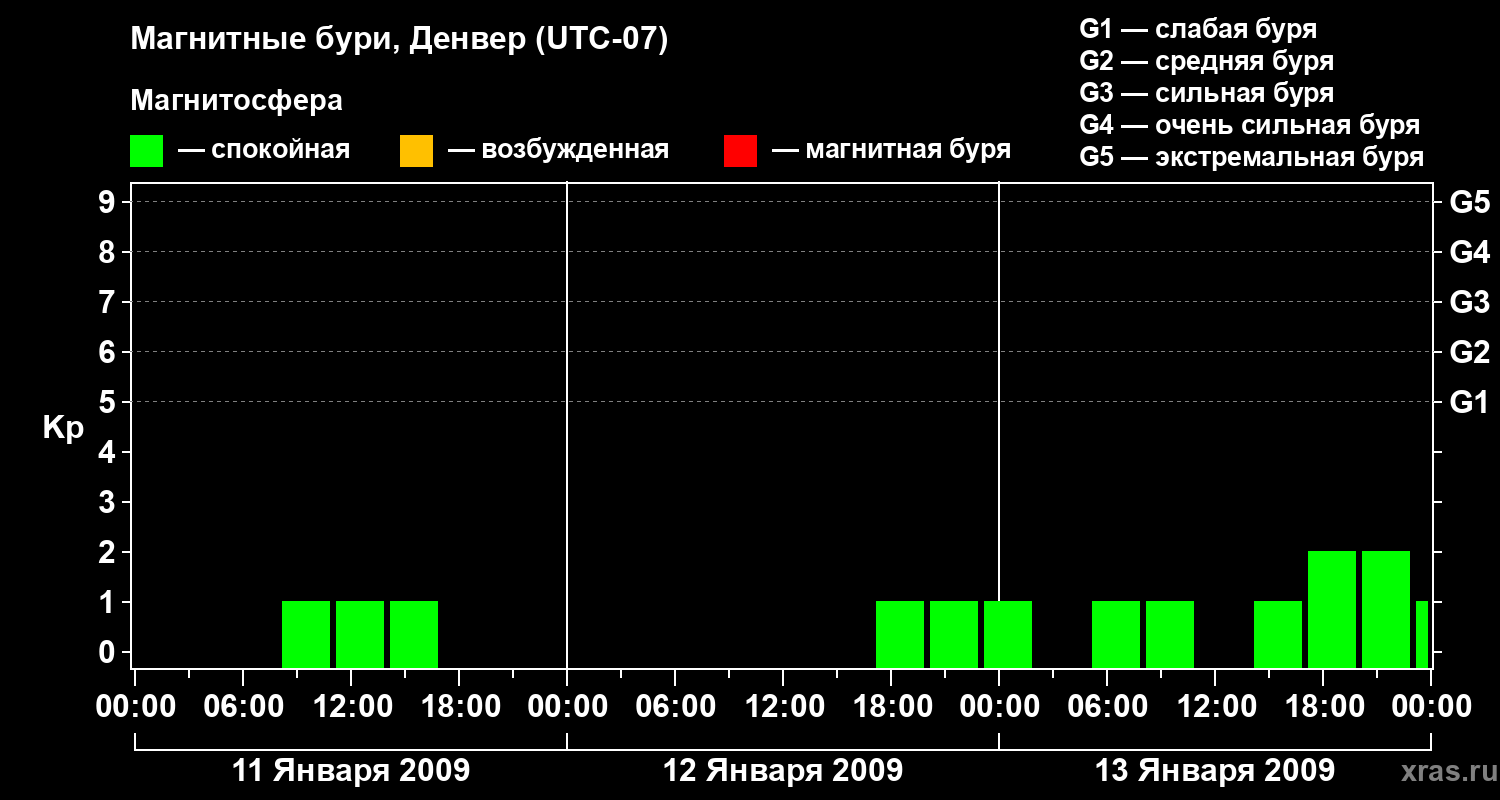 Изменения геомагнитного индекса Kp с 11 по 13 января 2009 года для средних широт