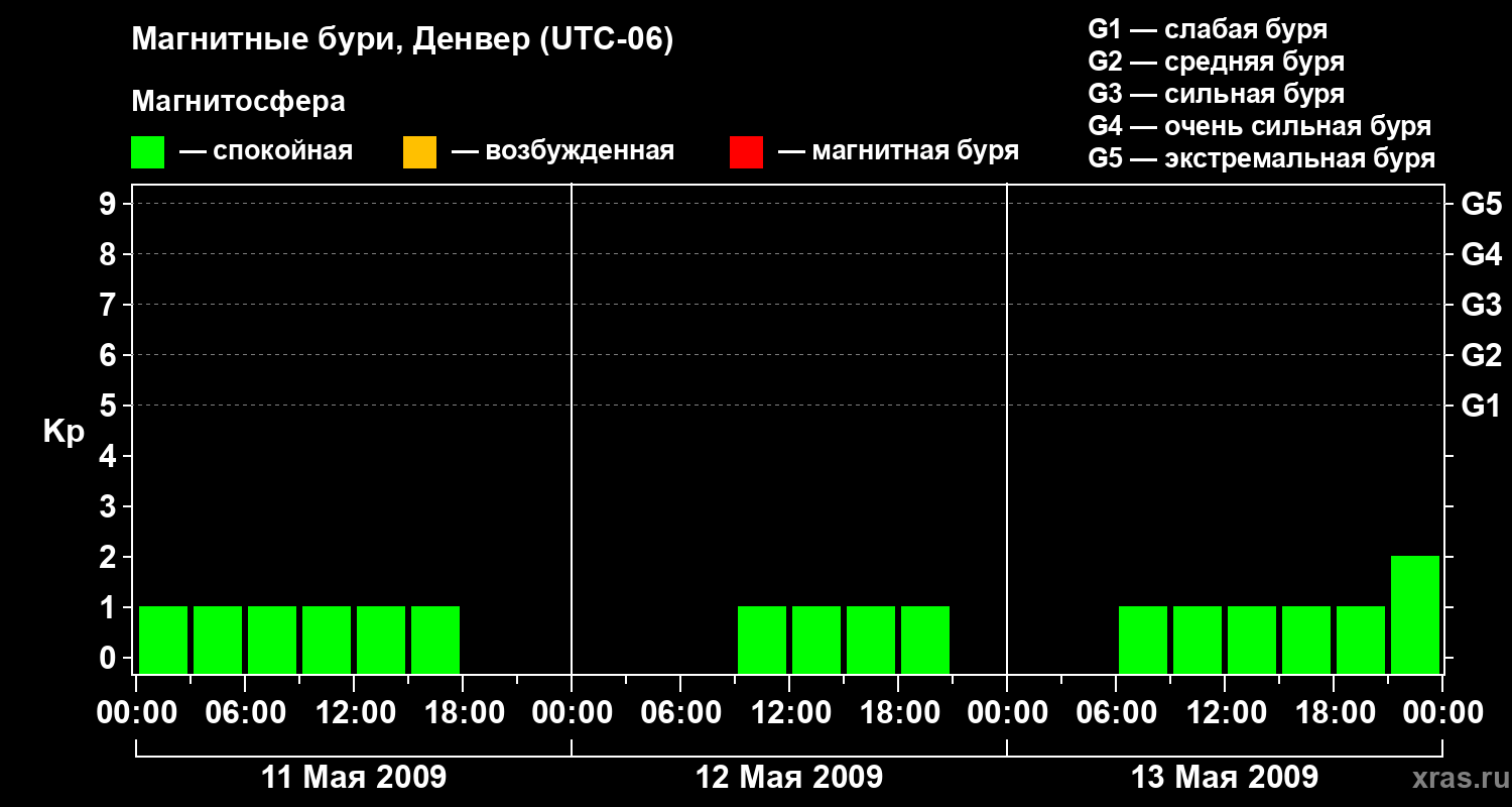 Изменения геомагнитного индекса Kp с 11 по 13 мая 2009 года для средних широт