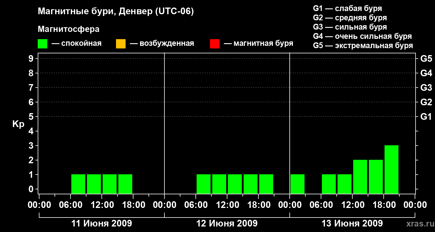 Изменения геомагнитного индекса Kp с 11 по 13 июня 2009 года для средних широт