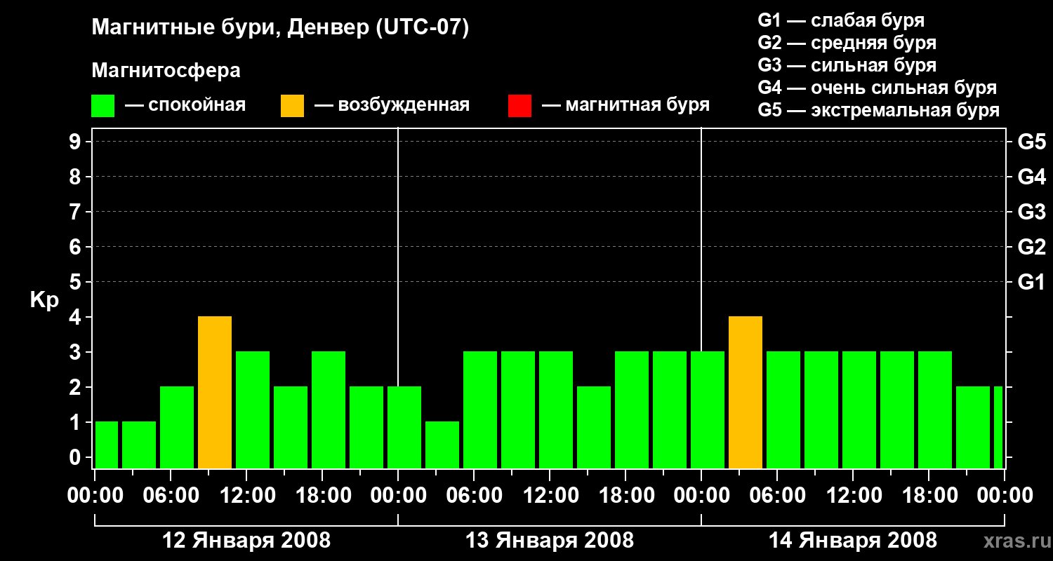 Изменения геомагнитного индекса Kp с 12 по 14 января 2008 года для средних широт