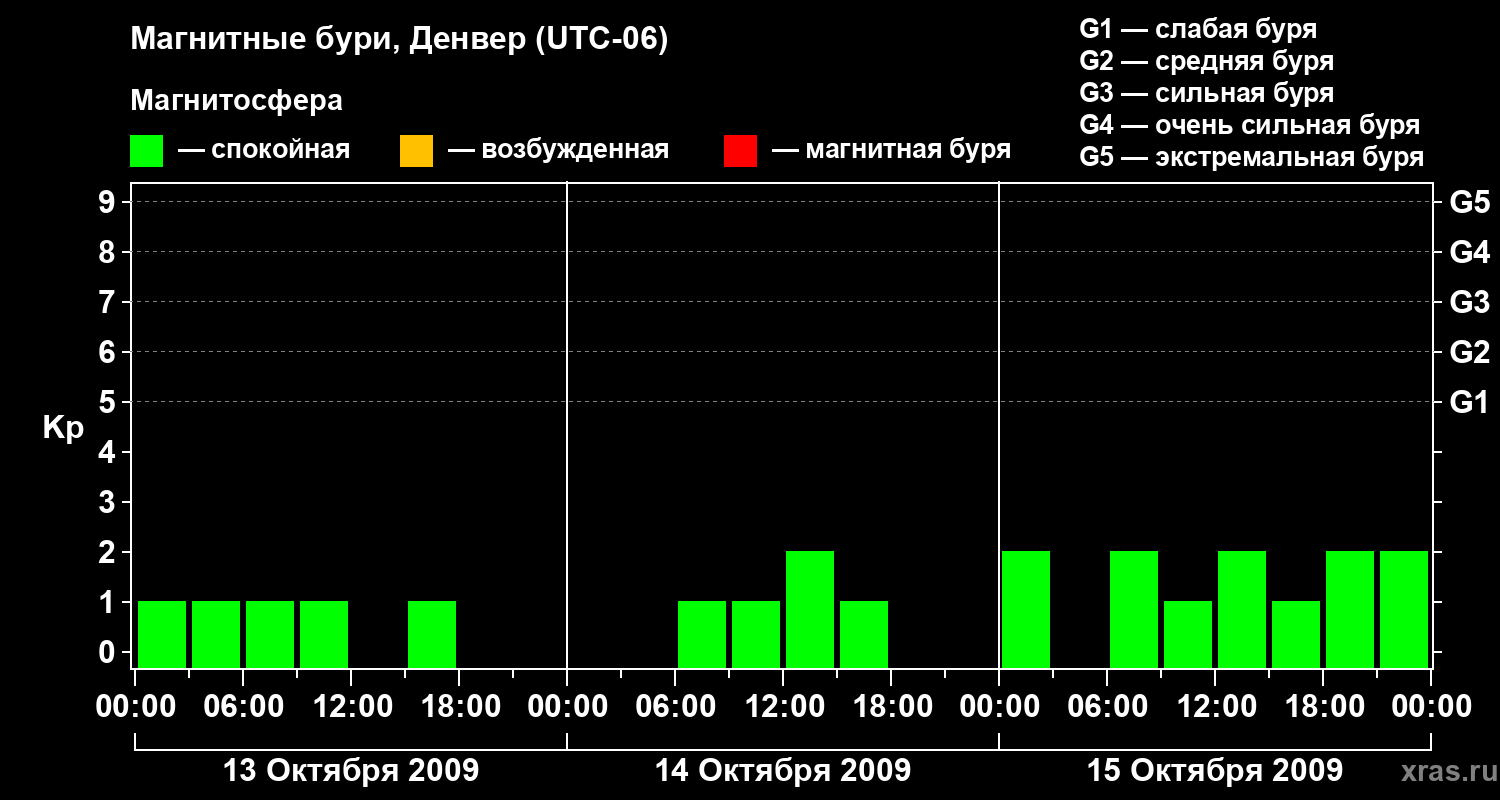 Изменения геомагнитного индекса Kp с 13 по 15 октября 2009 года для средних широт