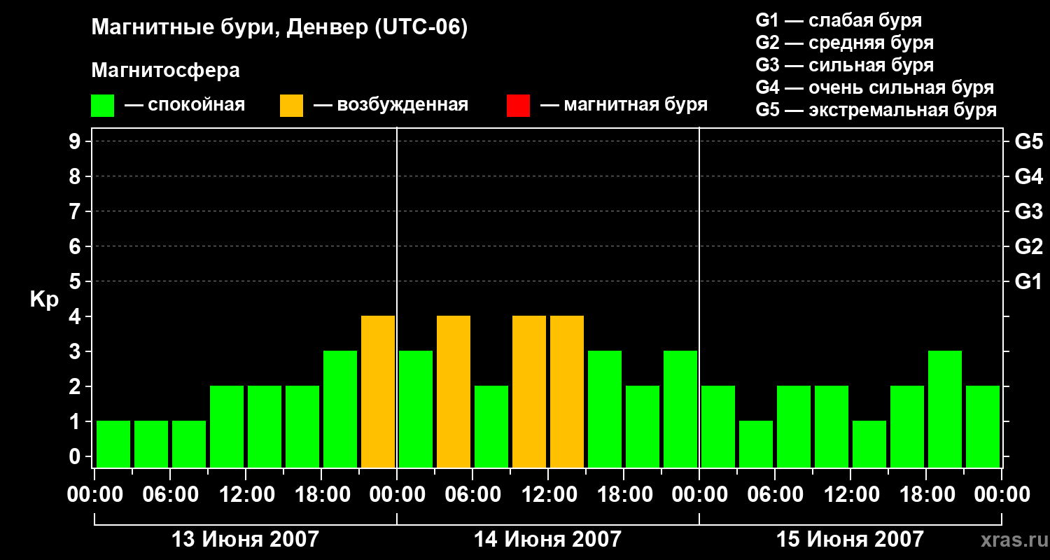 Изменения геомагнитного индекса Kp с 13 по 15 июня 2007 года для средних широт