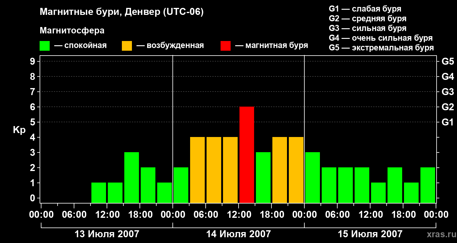 Изменения геомагнитного индекса Kp с 13 по 15 июля 2007 года для средних широт