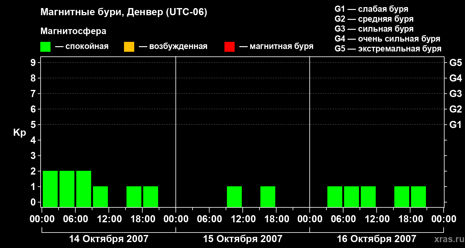 Изменения геомагнитного индекса Kp с 14 по 16 октября 2007 года для средних широт