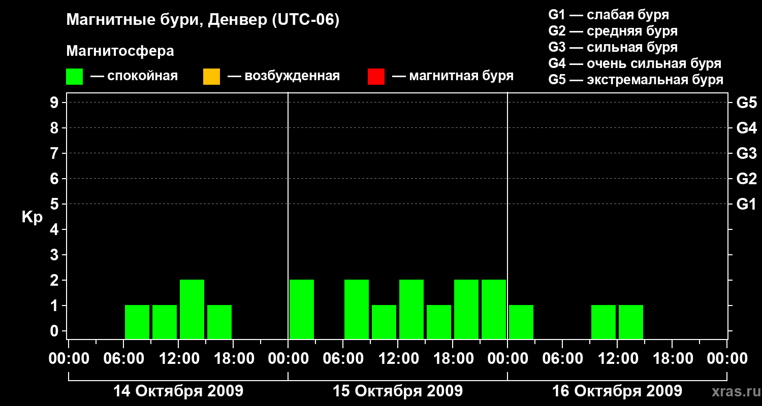 Изменения геомагнитного индекса Kp с 14 по 16 октября 2009 года для средних широт