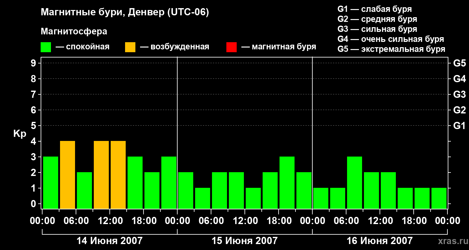 Изменения геомагнитного индекса Kp с 14 по 16 июня 2007 года для средних широт