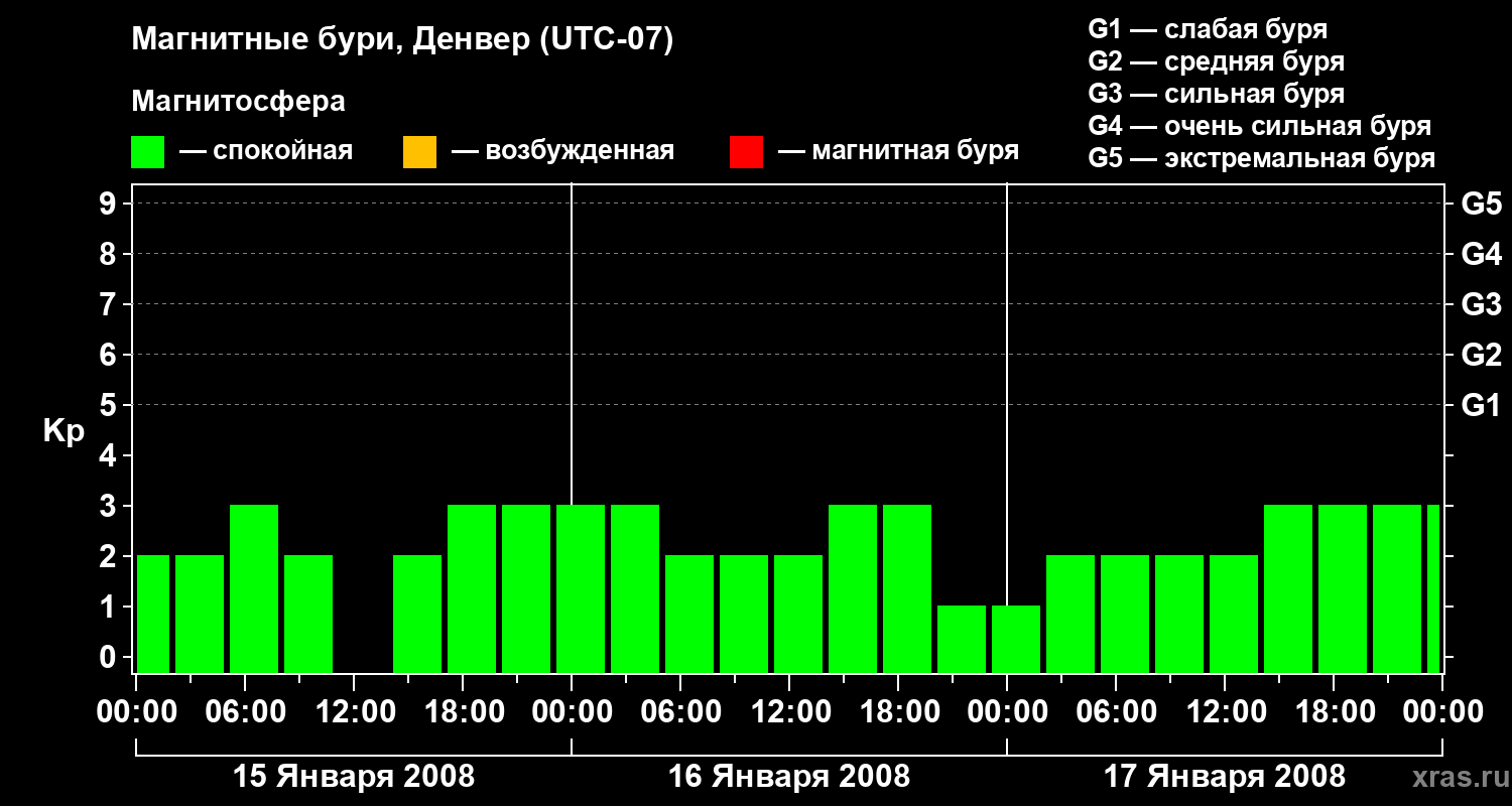 Изменения геомагнитного индекса Kp с 15 по 17 января 2008 года для средних широт