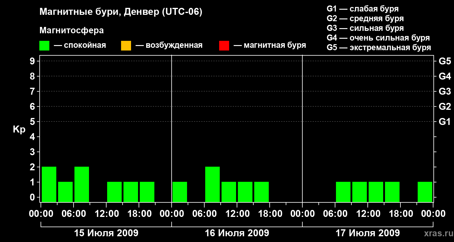 Изменения геомагнитного индекса Kp с 15 по 17 июля 2009 года для средних широт