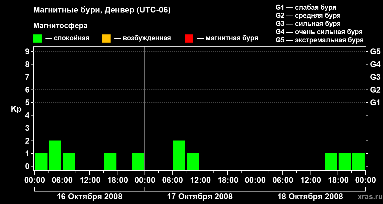 Изменения геомагнитного индекса Kp с 16 по 18 октября 2008 года для средних широт
