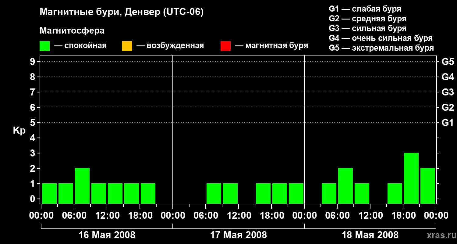 Изменения геомагнитного индекса Kp с 16 по 18 мая 2008 года для средних широт