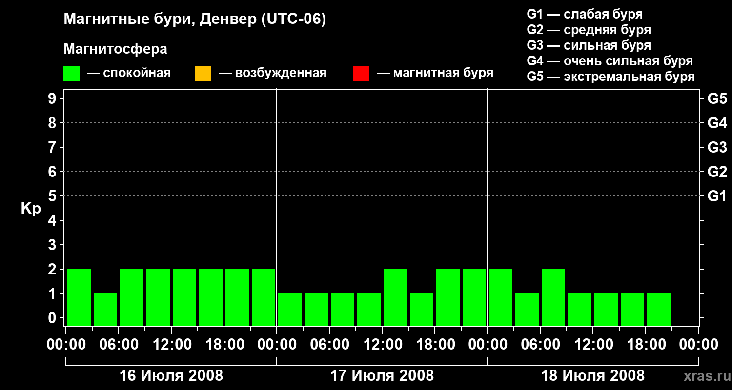 Изменения геомагнитного индекса Kp с 16 по 18 июля 2008 года для средних широт