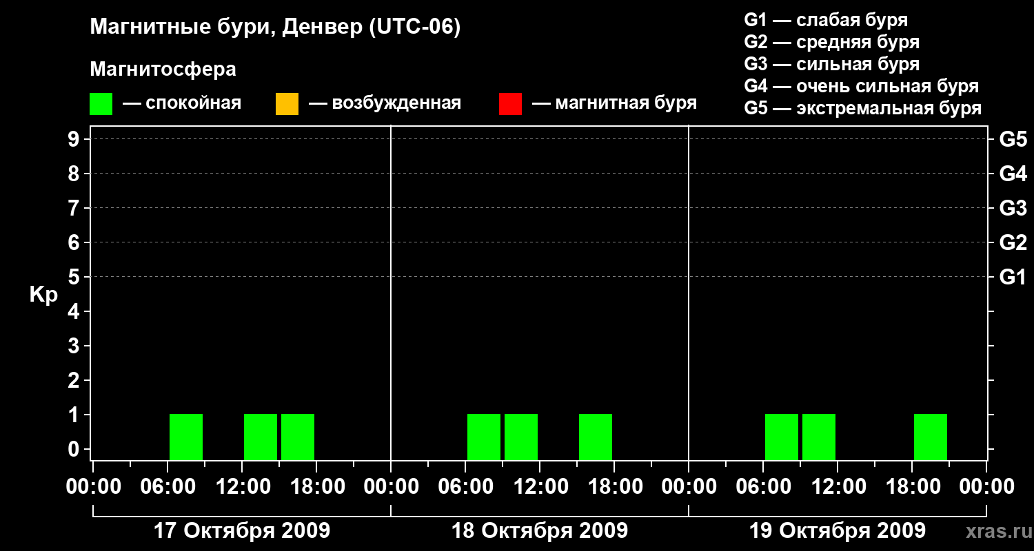 Изменения геомагнитного индекса Kp с 17 по 19 октября 2009 года для средних широт