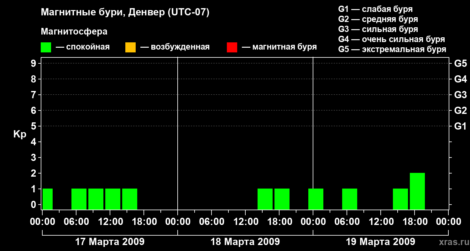 Изменения геомагнитного индекса Kp с 17 по 19 марта 2009 года для средних широт