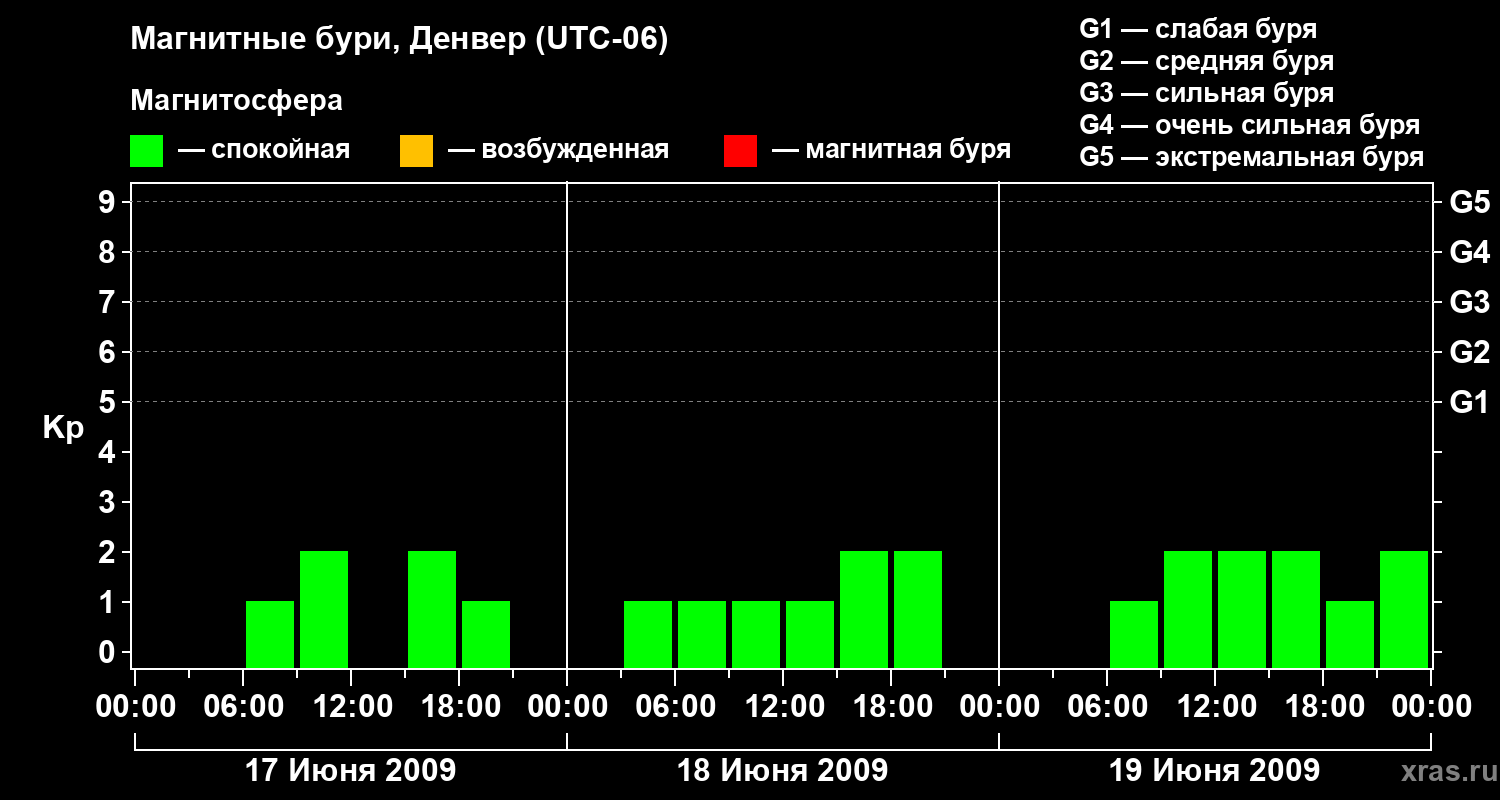 Изменения геомагнитного индекса Kp с 17 по 19 июня 2009 года для средних широт