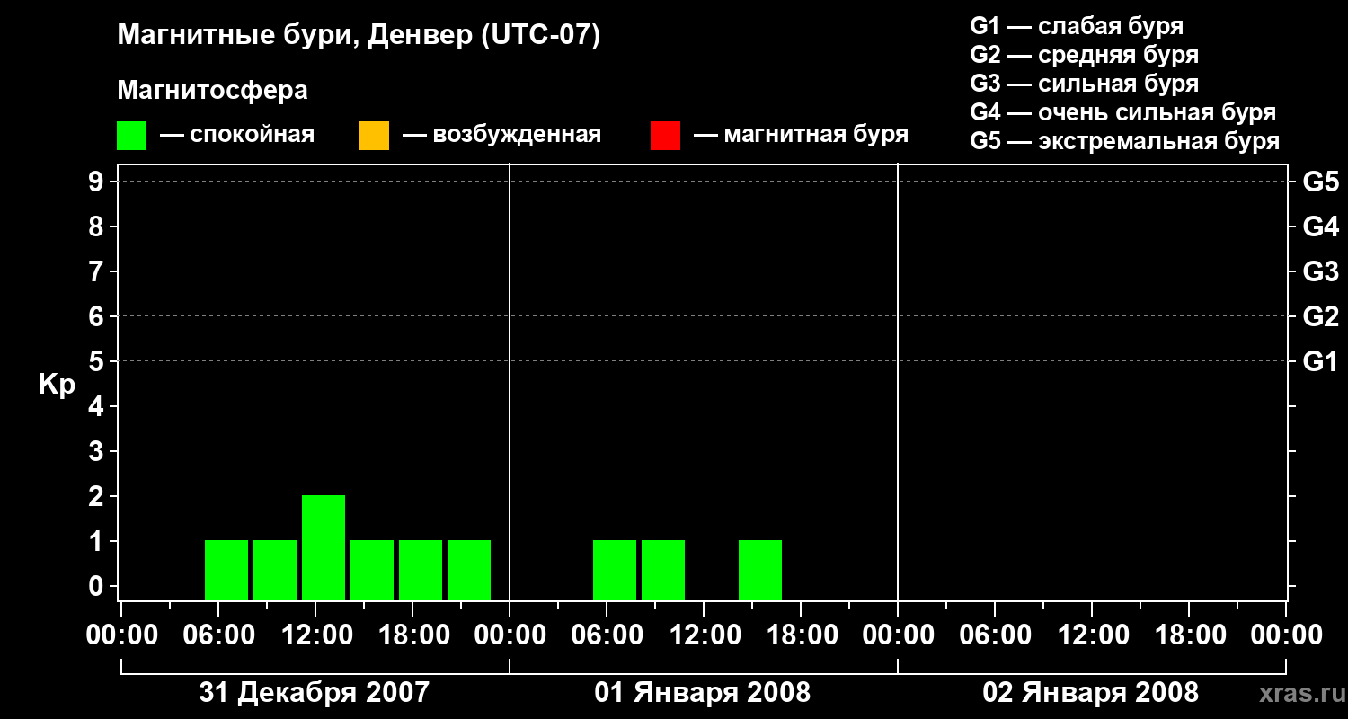 Изменения геомагнитного индекса Kp с 31 декабря 2007 года по 2 января 2008 года для средних широт