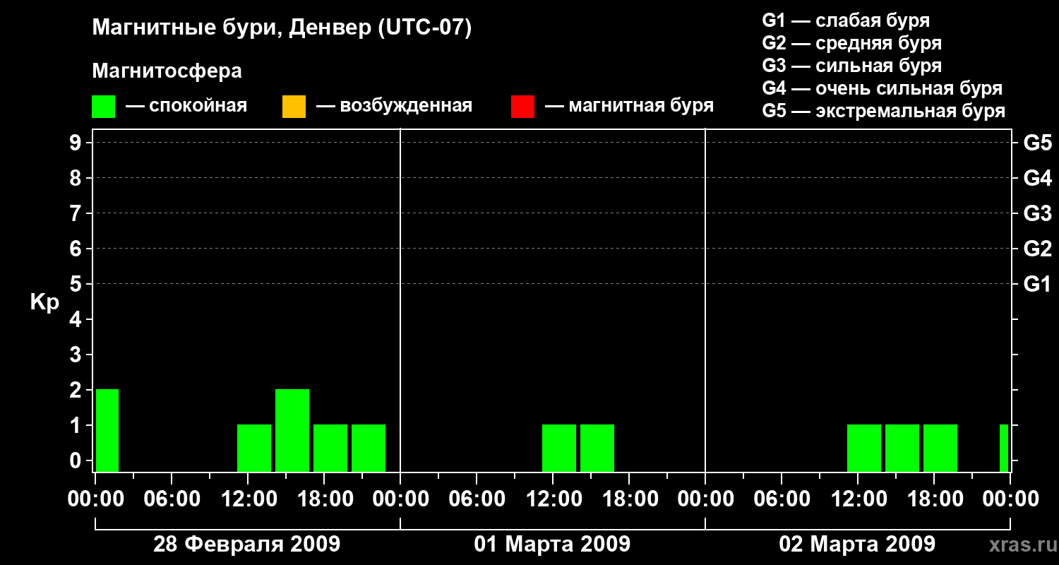 Изменения геомагнитного индекса Kp с 28 февраля по 2 марта 2009 года для средних широт