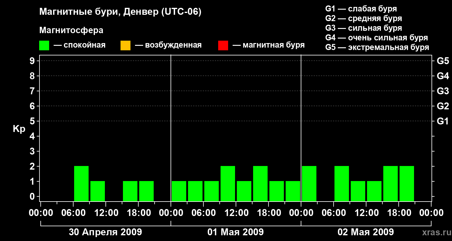 Изменения геомагнитного индекса Kp с 30 апреля по 2 мая 2009 года для средних широт