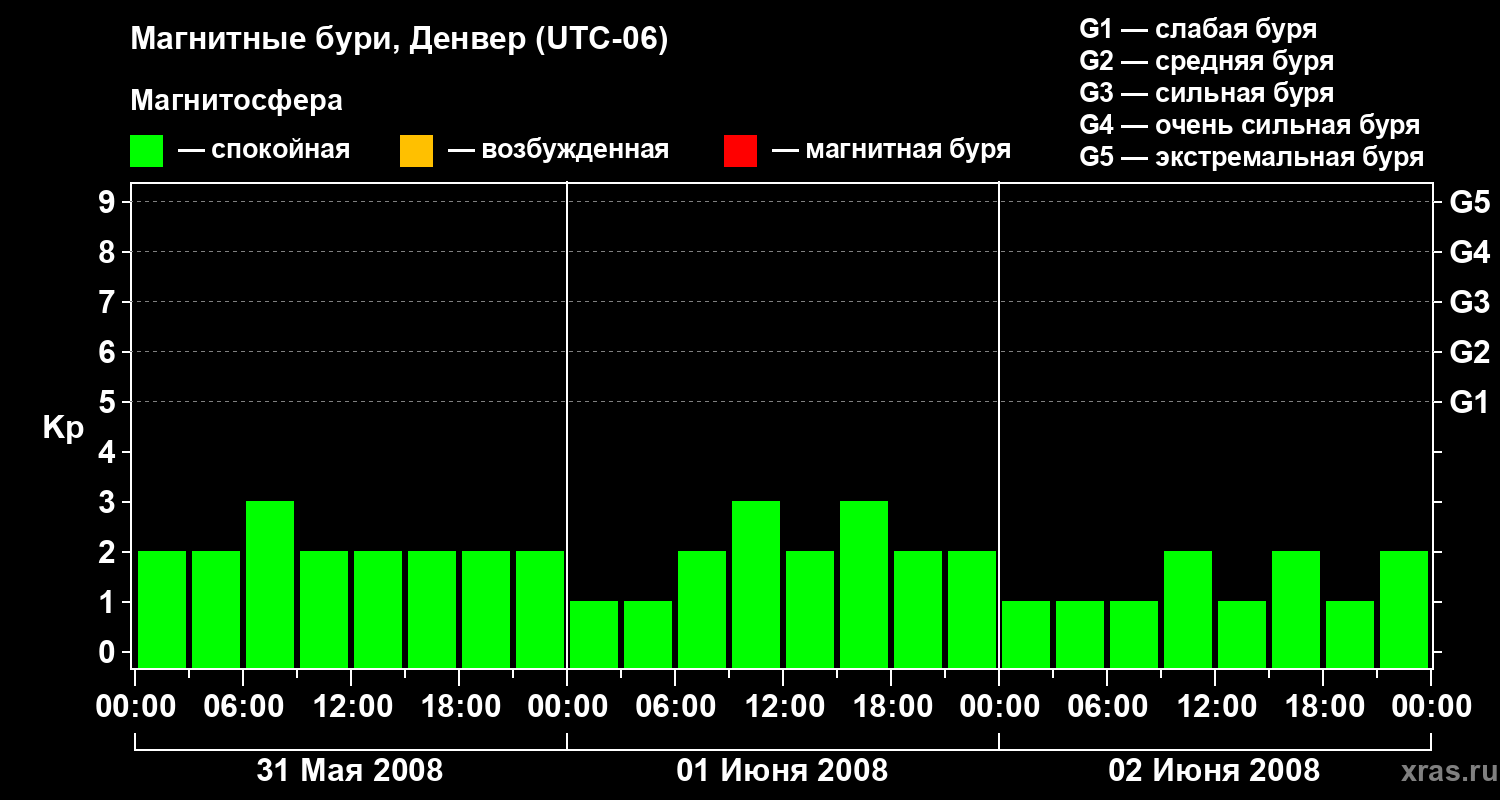 Изменения геомагнитного индекса Kp с 31 мая по 2 июня 2008 года для средних широт