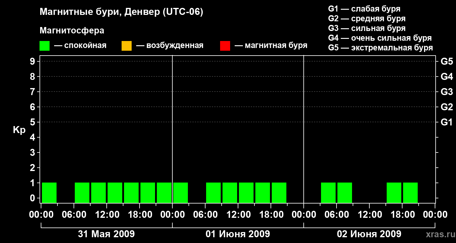 Изменения геомагнитного индекса Kp с 31 мая по 2 июня 2009 года для средних широт