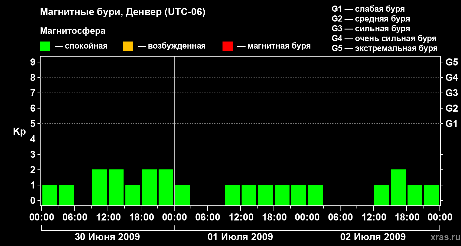 Изменения геомагнитного индекса Kp с 30 июня по 2 июля 2009 года для средних широт