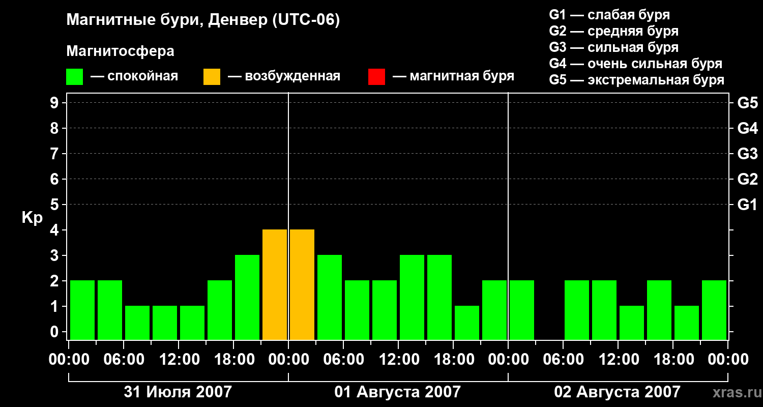 Изменения геомагнитного индекса Kp с 31 июля по 2 августа 2007 года для средних широт