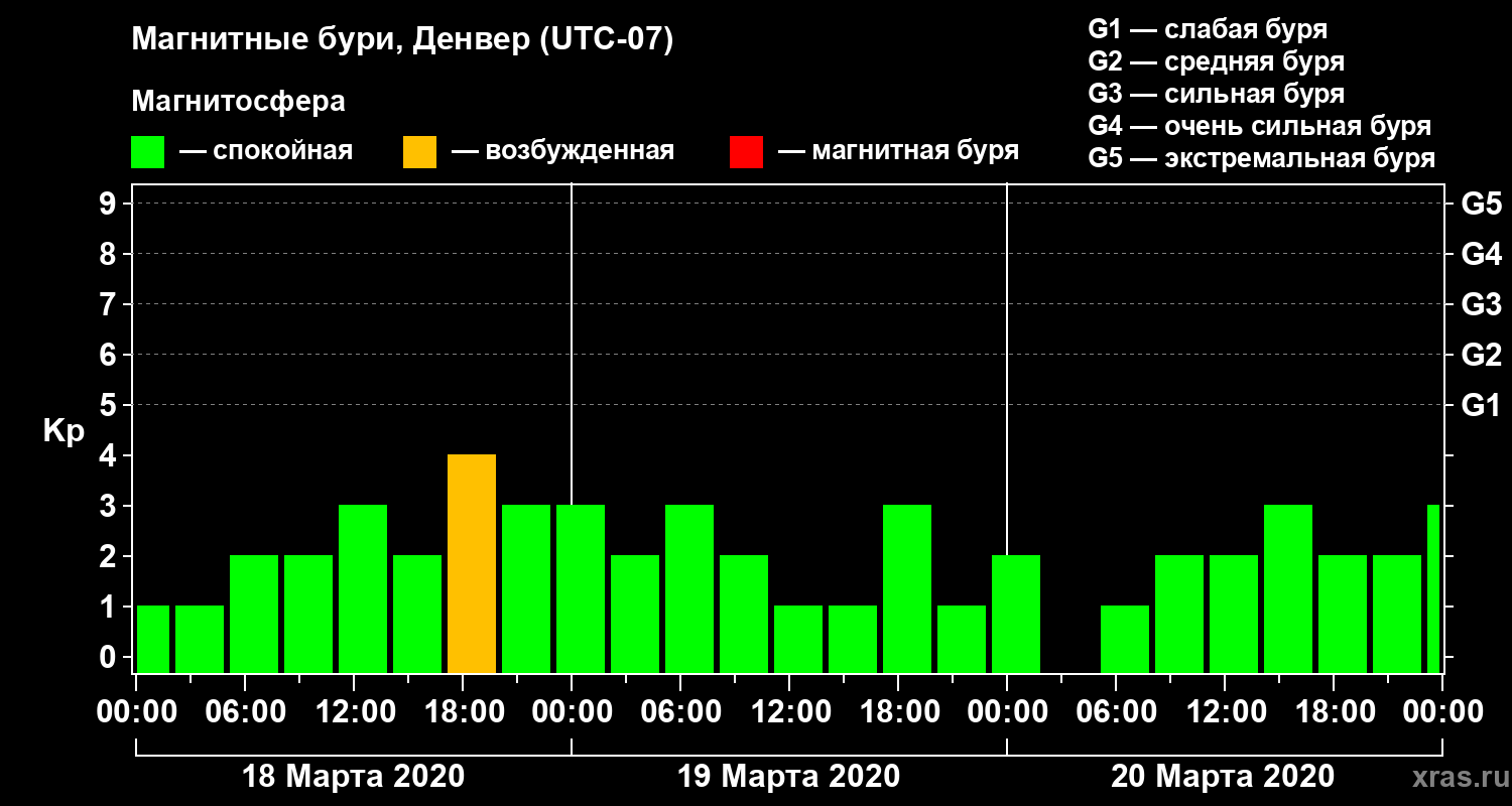 Изменения геомагнитного индекса Kp с 18 по 20 марта 2020 года для средних широт