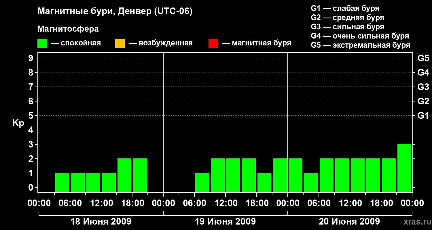 Изменения геомагнитного индекса Kp с 18 по 20 июня 2009 года для средних широт
