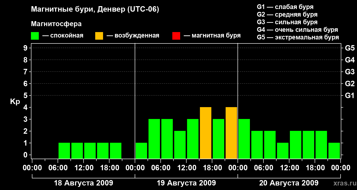 Изменения геомагнитного индекса Kp с 18 по 20 августа 2009 года для средних широт