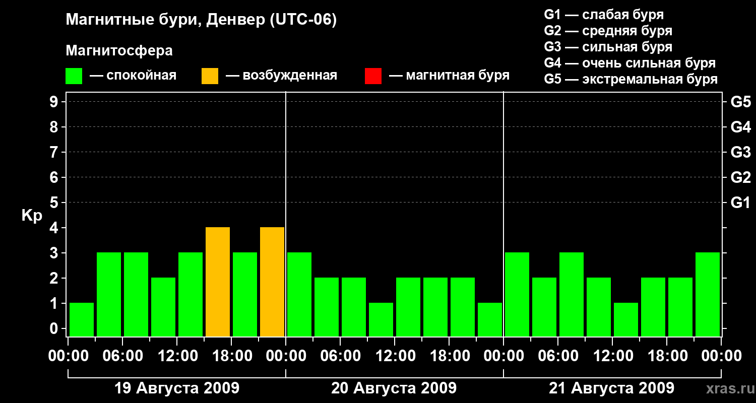 Изменения геомагнитного индекса Kp с 19 по 21 августа 2009 года для средних широт