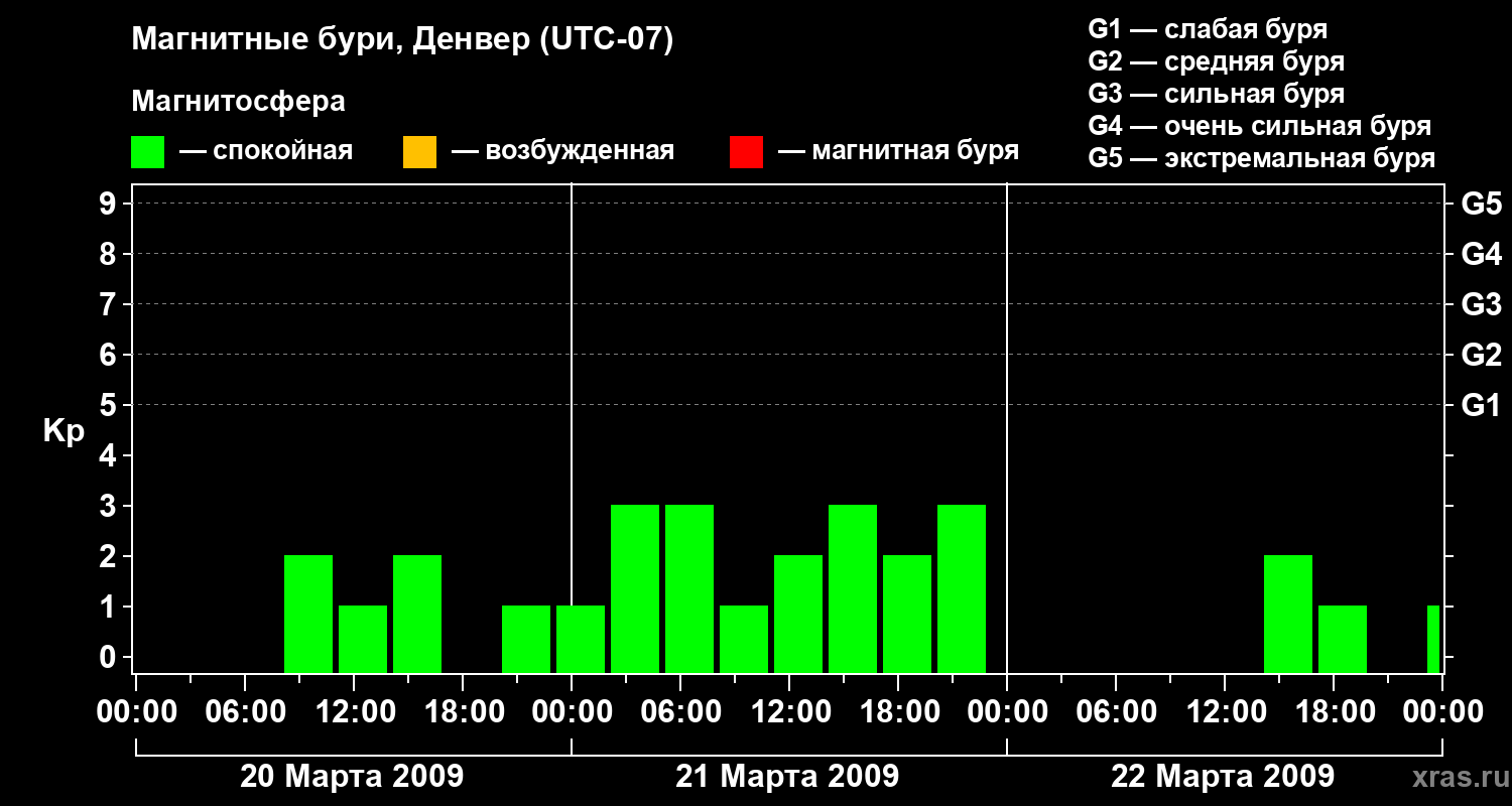 Изменения геомагнитного индекса Kp с 20 по 22 марта 2009 года для средних широт