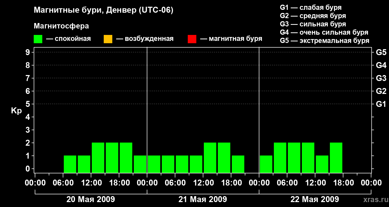 Изменения геомагнитного индекса Kp с 20 по 22 мая 2009 года для средних широт