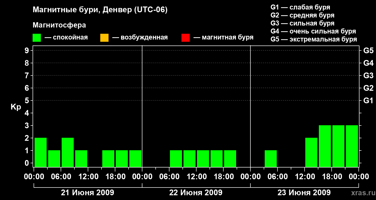 Изменения геомагнитного индекса Kp с 21 по 23 июня 2009 года для средних широт