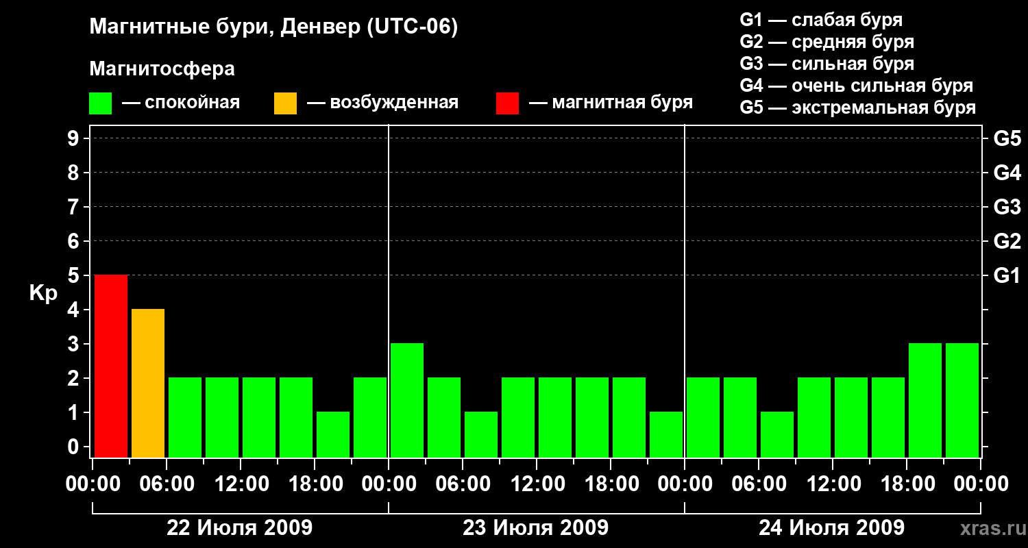 Изменения геомагнитного индекса Kp с 22 по 24 июля 2009 года для средних широт