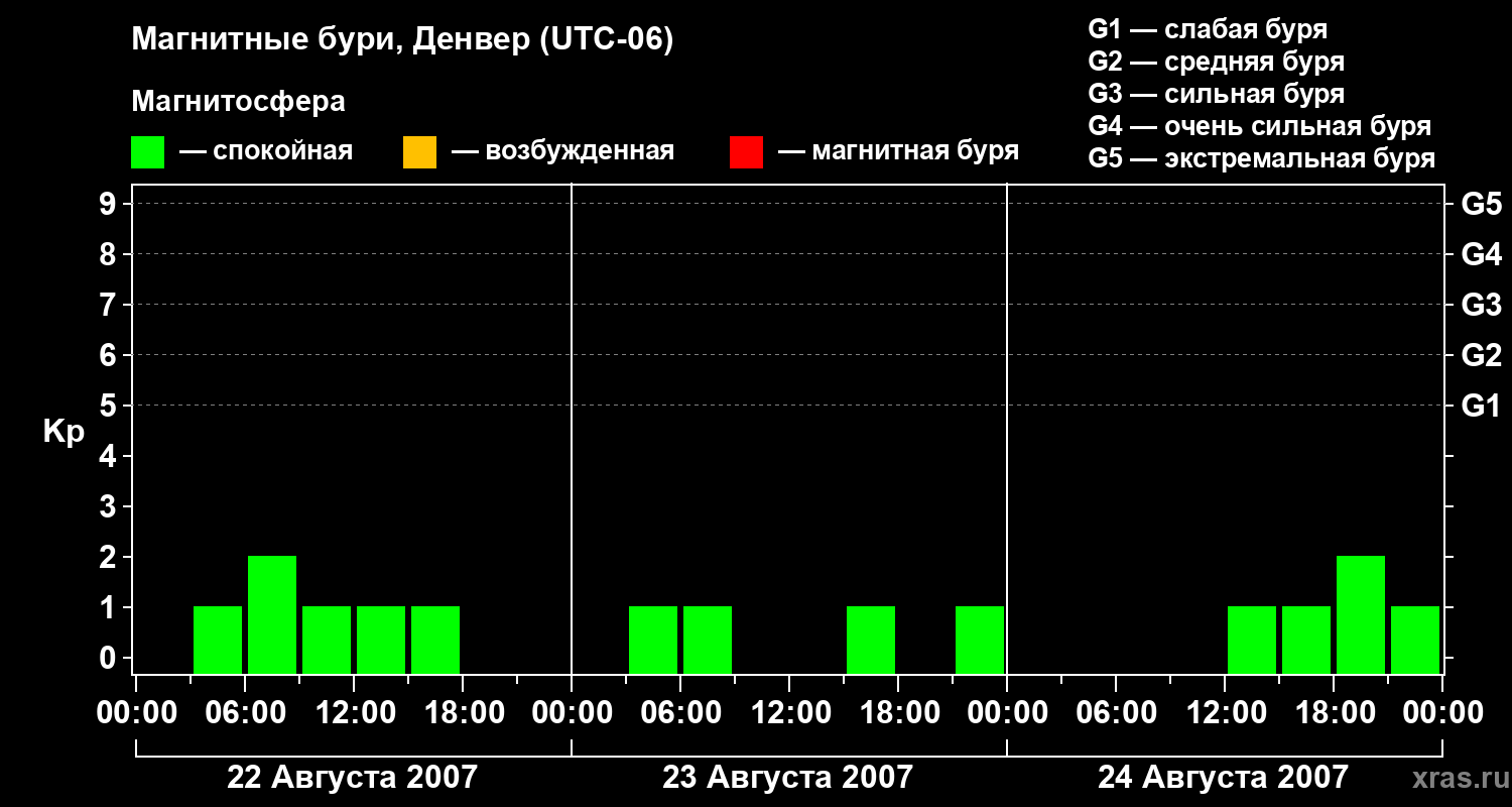 Изменения геомагнитного индекса Kp с 22 по 24 августа 2007 года для средних широт