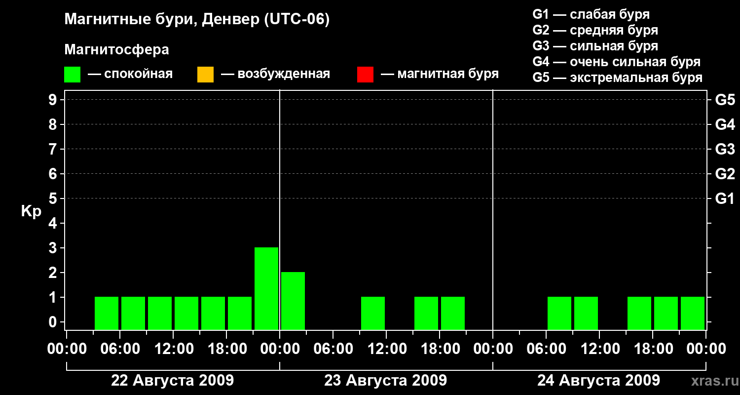 Изменения геомагнитного индекса Kp с 22 по 24 августа 2009 года для средних широт