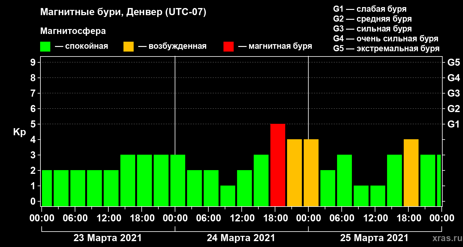 Изменения геомагнитного индекса Kp с 23 по 25 марта 2021 года для средних широт