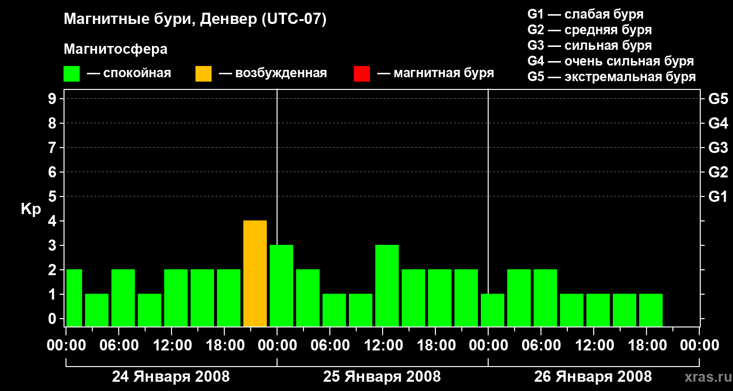 Изменения геомагнитного индекса Kp с 24 по 26 января 2008 года для средних широт