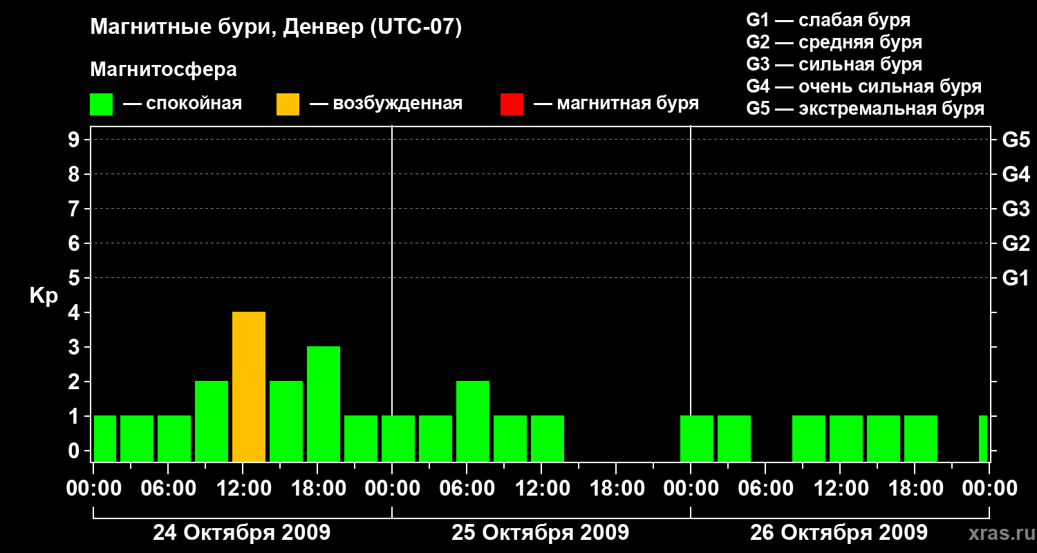 Изменения геомагнитного индекса Kp с 24 по 26 октября 2009 года для средних широт