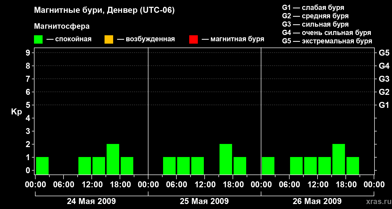 Изменения геомагнитного индекса Kp с 24 по 26 мая 2009 года для средних широт