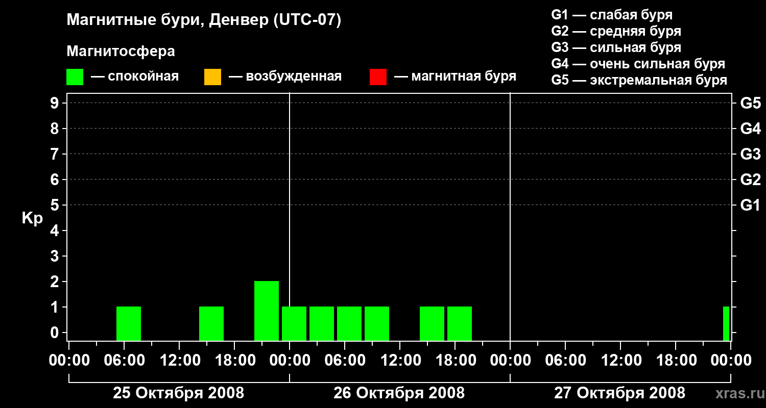 Изменения геомагнитного индекса Kp с 25 по 27 октября 2008 года для средних широт