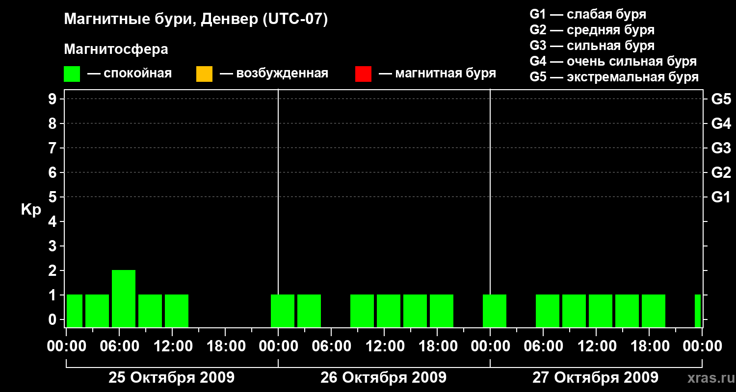 Изменения геомагнитного индекса Kp с 25 по 27 октября 2009 года для средних широт