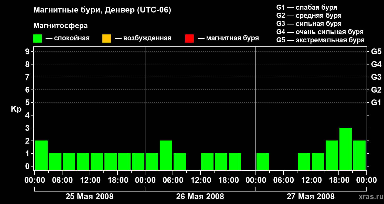 Изменения геомагнитного индекса Kp с 25 по 27 мая 2008 года для средних широт