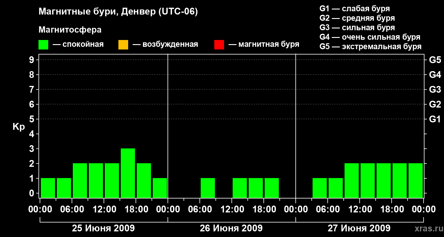 Изменения геомагнитного индекса Kp с 25 по 27 июня 2009 года для средних широт